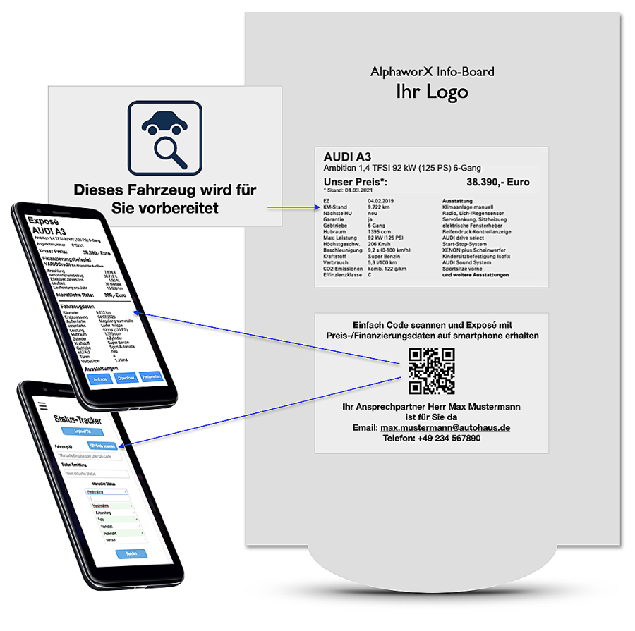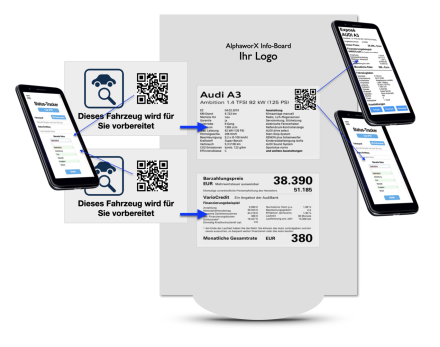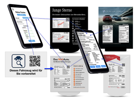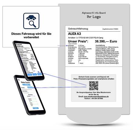 - Standard "Fahrzeuginfo-Template mit QR-Code" mit Kontaktdaten zur Übertragung auf Info-Board oder optional nach Ihren Vorgaben